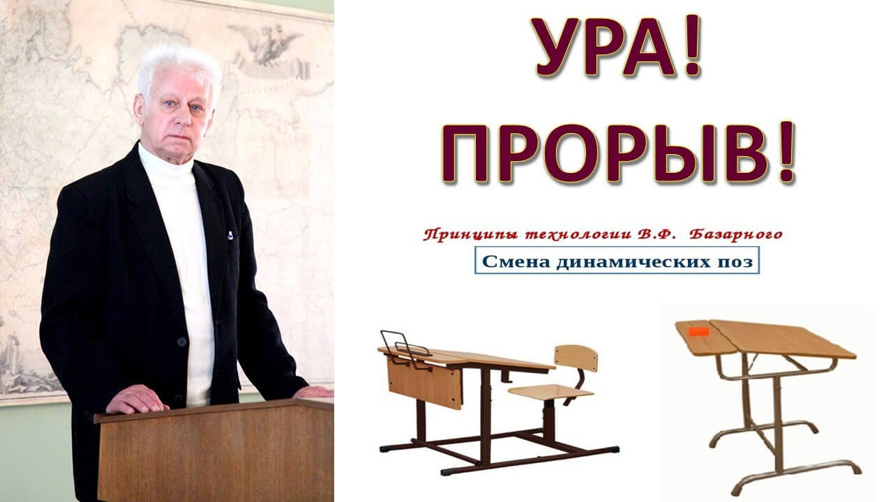 Помощь Школе можно оказать переводом пожертвования на карту: карта МИР 2202 2023 6771 0690 Наш товарищ и соратник из Белоруссии Аркадий Розбаш способствовал тому, чтобы либеральный фронт в образовании был прорван, и наши дети смогли бы впитывать в себя коды собственной цивилизации. В г.Полоцк создан первый класс правильного образования. В основе методика русского ученого Базарного Владимира Филипповича. Владимир Филиппович Базарный (4 мая 1942, Юрковцы, Талалаевский район, Сумская область, УССР, СССР — 10 января 2022, Пушкино) — российский учёный, врач, педагог. Доктор медицинских наук; Почётный работник общего образования Российской Федерации. Родился 4 мая 1942 года в селе Юрковцы Талалаевского района Сумской области УССР в семье крестьянки Анастасии Ивановны и сельского учителя Филиппа Максимовича Базарного. Отец был на фронте, семья пережила оккупацию. После войны семья переехала в сибирский город Тайшет, где Владимир Базарный получил среднее образование во 2-й школе города. После окончания школы учился во Всесоюзном заочном университете народного творчества имени Крупской в Москве, затем — курс в Иркутском военно-техническом авиационном училище. В 1966 году окончил с отличием Красноярский государственный медицинский институт по специальности врача-офтальмолога. Работал хирургом, затем заведующим отделением в красноярской краевой детской офтальмологической больнице. Сделал более 6 тысяч операций. Хирург высшей квалификации. В 1977—1991 гг. руководил единственной в стране лабораторией сенсорных систем (органов чувств) в НИИ медицинских проблем Севера Сибирского отделения АМН СССР. С 1991 года по приглашению руководства Московской области возглавил Научно-внедренческую лабораторию физиолого-здравоохранительных проблем образования администрации Московской области (г. Сергиев Посад). Являлся научным руководителем программ Российского Союза за здоровое развитие детей. Скончался 10 января 2022 года от последствий ишемического инсульта. В 1986 году постановлением №2 Пленума Научного Совета №37 АМН СССР результаты исследований В.Ф. Базарного были признаны научным открытием, а разработанную им «Систему массовой профилактики близорукости и нарушений осанки у детей и подростков» Министерству просвещения и Академии педагогических наук СССР было рекомендовано включить в соответствующие положения реформы общеобразовательной школы. Разработчик нового направления в науке и образовании - здоровьеразвивающей педагогики. Автор собственной педагогической системы — т. н. системы Базарного, в разной степени использующейся сегодня в большинстве регионов России, в частности, в Белгородской области, в Республике Коми и в Ставропольском крае. На государственном уровне здоровьеразвивающие технологии Базарного внедряются в республике Азербайджан. Программа утверждена министерством здравоохранения РСФСР в 1989 году как «Массовая первичная профилактика школьных форм патологии, или развивающие здоровье принципы конструирования учебно-познавательной деятельности в детских садах и школах». Разработанная Владимиром Базарным учебная мебель «конторка» (конторка Базарного) и связанное с нею обучение в режиме «динамических поз» включены в СанПиНы 2.4.2.2821-10 «Санитарно-эпидемиологические требования к условиям и организации обучения в общеобразов