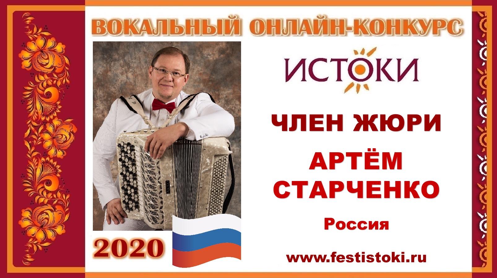 Певец, композитор, баянист. Лауреат Национальной премии «Серебряный лучник» (США) за масштабный культурно-просветительский проект «Шедевры русской музыки от фольклора до классики». Член Российского Авторского Общества. #фестивальистоки #festistoki #истоки #русскаяпесня #русскаякультура #соотечественники #Россия #дети Сайт: www.festistoki.ru / www.festistoki.com E-mail: festistoki@mail.ru