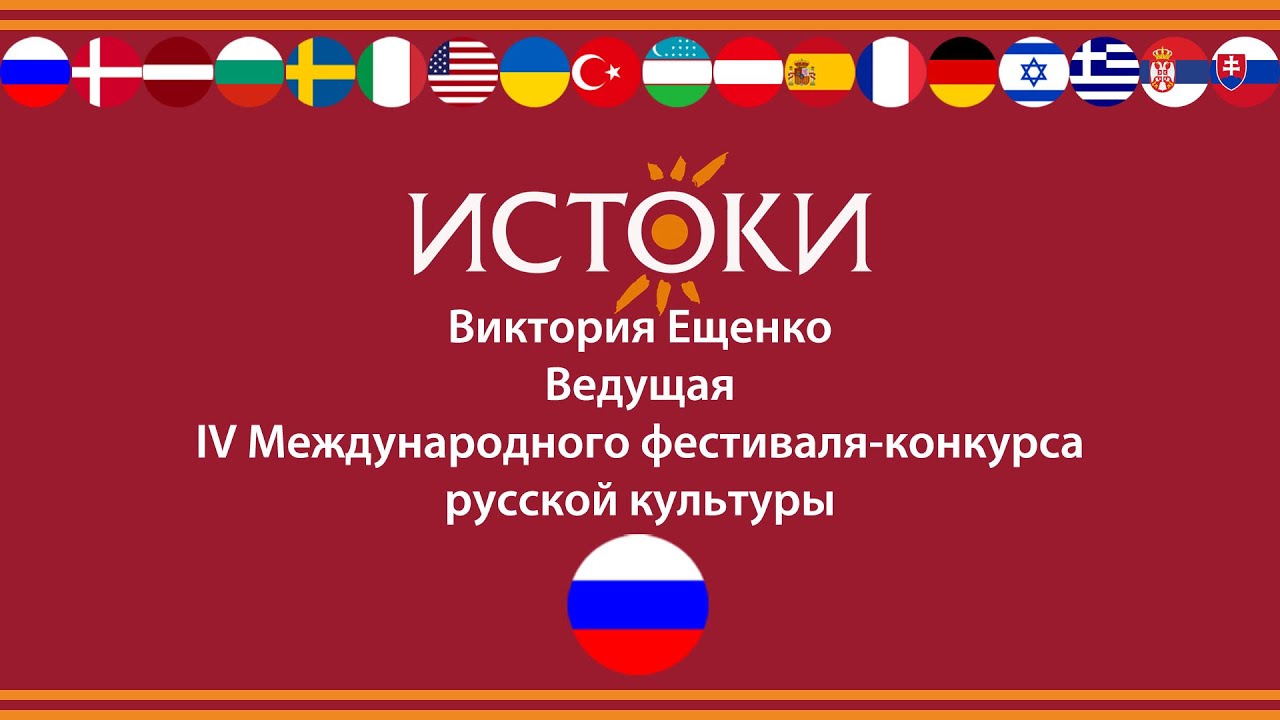 Виктория Ещенко – «Песня о России» Фестиваль-конкурс русской культуры «Истоки» ставит своей задачей показать многообразие и красоту русской культуры, которая на протяжении многих веков формировалась за счет традиций многонациональности и добрососедства. Фестиваль-конкурс русской культуры «Истоки» - многоплановое мероприятие, которое объединяет конкурс вокалистов, обширную экскурсионную и культурную программу, концертные выступления, гала-концерт и награждение участников фестиваля-конкурса. Мы расширяем русскоязычное пространство. Благодаря поддержке Россотрудничества в фестивале принимают участие дети-соотечественники, проживающие за рубежом. Сайт: www.festistoki.ru E-mail: festistoki@mail.ru