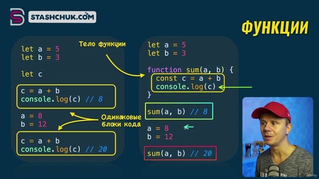Функция - это блок кода, который можно выполнять многократно. Вы мотивируете выкладывать больше полезного контента, когда поддерживаете канал: https://boosty.to/worcel/donate Поддержите канал, сделайте заказ по ссылке: Викиум – это онлайн-платформа для тренировки памяти, внимания и мышления - https://is.gd/OguZll GeekBrains — это образовательная экосистема. В ней любой человек с нуля может освоить профессию в области программирования, маркетинга, управления и дизайна и гарантированно найти работу - https://is.gd/RPBEDS Skypro — онлайн-университет рентабельного образования. Учим IT-профессиям с нуля и гарантируем новую работу - https://is.gd/0GXfNR Знанио — ведущий портал дополнительного образования для взрослых и детей - https://is.gd/E5Ess3 Zaochnik — крупнейший образовательный сервис для студентов, работает с 2000 года, от контрольных и рефератов до диссертаций - https://is.gd/jk9930 Напишем - напишут всё что нужно - https://is.gd/Ebj6ov Алгоритмика — международная школа программирования и математики для детей от 6 до 17 лет - https://is.gd/NNmiHL Тетрика — это команда опытных репетиторов, со специалистами по любому предмету с 1 по 11 класс, английский для взрослых и удобная интерактивная платформа для онлайн-уроков - https://is.gd/brw69z #java #javascript