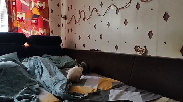 Умный грызлик кролик дома гладит одеяло