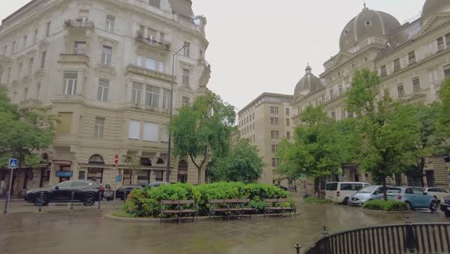 Насладитесь достопримечательностями и звуками Пятого района Будапешта во время прогулки дождливым утром.