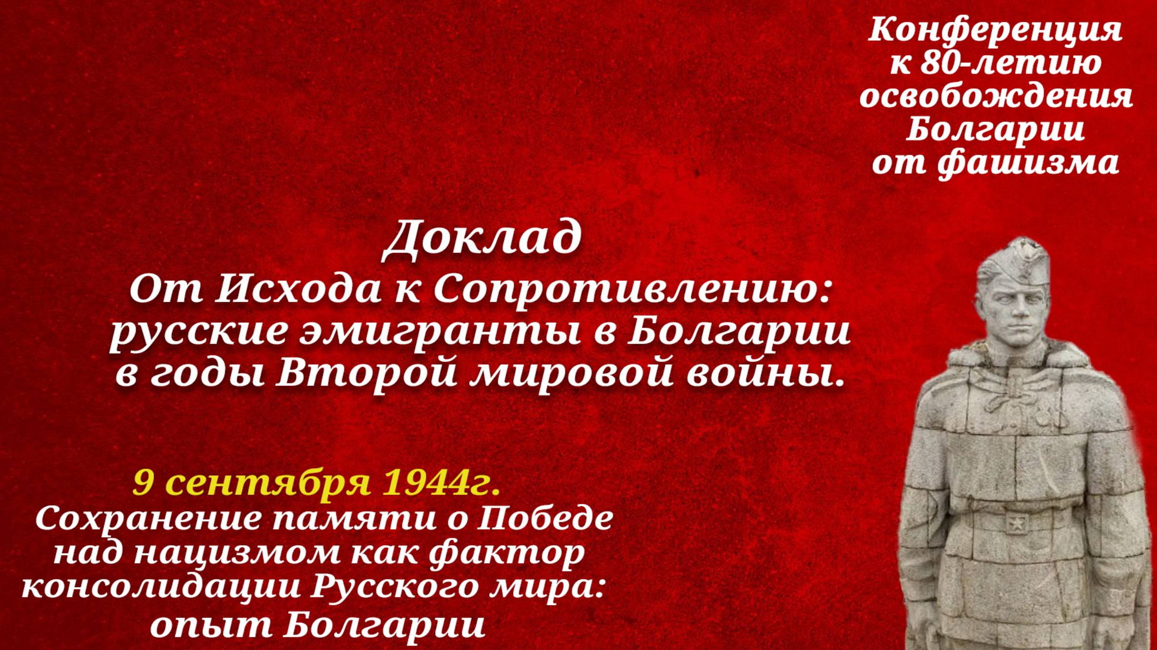 Конференция к 80-летию освобождения Болгарии от фашизма. 9 сентября 1944г. Сохранение памяти о Победе над нацизмом как фактор консолидации Русского мира: опыт Болгарии. В этом видео Доклад Марины Сорокиной, кандидата исторических наук, заведующей Отделом истории российского зарубежья Дома русского зарубежья имени А. Солженицына, От Исхода к Сопротивлению: русские эмигранты в Болгарии в годы Второй мировой войны.