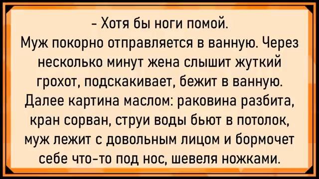 Как мужику чуть не оторвали! Сборник свежих анекдотов! Юмор! 00:00 Возврат робота-пылесоса • Клиент хочет вернуть робот-пылесос, купленный неделю назад. • Объясняет, что пылесос три раза затянул кота, и теперь Барсик сам поддерживает чистоту. 00:29 Новый русский в музее • Новый русский нагло ведёт себя в музее, трогает экспонаты и пытается играть на дудочке. • Экскурсовод терпеливо ждёт, пока он наиграется. 00:57 Пожар в больнице • После пожара в больнице пожарные докладывают главврачу о пострадавших. • Главврач падает в обморок, узнав, что в подвале был морг. 01:18 Дольки для животных • Дед предлагает переписать завещание, перечисляя дольки для разных животных. 01:30 Муж и жена • Муж возвращается с работы и видит, что жена лежит в постели с сердцем. • В шкафу оказывается сосед Борис, который играл в прятки с сыном. 02:15 Кирпичи на крыше • Человек видит, как с крыши кидают кирпичи, а внизу их складывают. • Один из кирпичей падает на ногу человеку внизу. 02:38 Таможенник • Таможенник с русским акцентом пытается говорить на разных языках. 02:52 Разговор подруг • Одна из подруг рассказывает о обмене футболками футболистами. 03:15 Восьмое марта • Муж готовит завтрак, убирает квартиру, ходит по магазинам и готовит праздничный обед. 03:35 Маугли • Маугли жалуется на Бандерлогов, которые называют его земляным червяком. 04:00 Чукчи и верблюд • Чукчи не могут определить, что за зверь приплыл к ним, и обращаются к шаману. 04:25 Дискотека • Парень спрашивает девушку о её увлечениях, она перечисляет множество занятий. 04:40 Заначка • Ирка пытается прятать деньги, но глаза сами ведут, а руки берут. 04:51 Девиз детей • Девиз детей: «Если папа сказал нет, а мама сказала совсем нет, всегда есть запасной вариант — бабушкина да и дедушкина, конечно, да 14:09 История о мужике и лягушке • Мужик с «прибамбасом» 50 см хочет уменьшить его размер. • Колдунья советует спросить лягушку на болоте, выйдет ли она за него замуж. • После трёх отказов лягушки размер уменьшается до 30 см, но мужика всё равно не устраивает. 14:57 Разговор о хирурге • Сын спрашивает отца, как правильно пишется «хирург». • Отец отвечает, что это зависит от того, хороший ли он врач. 15:08 Подготовка к выставке • Казимир не успевает подготовиться к выставке. • Он обещает всё сделать за пять минут. 15:19 Пьяный муж и жена • Жена отчитывает пьяного мужа. • Муж предлагает написать всё, а утром прочитать и ответить. 15:33 Кондиционер в офисе • Дама обижается на мужчин за то, что они не включают кондиционер. • Секретарша замечает, что платье дамы просвечивает. 15:54 Вопрос в магазине • Мужик спрашивает о шапочке для плавания, клюшке для хоккея и лыжах. • Продавец отвечает, что это виноводочный магазин, и мужик просит бутылку водки. 16:13 Новый год и тёща • Мудрый Семён Маркович сравнивает Новый год с тёщей. 16:23 Женщина и автобус • Женщина-репатриантка обращается к автобусу как к предмету женского рода. • Водитель поправляет её, говоря, что автобус — предмет мужского рода. 17:01 Диетолог и Василий • Диетолог спрашивает Василия о его рационе. • Василий отвечает, что ест здоровую пищу: свиные отбивные, картошку и водку. 17:22 Новые русские и таксист • Новый русский теряет деньги в такси, таксист убегает. • Новый русский находит деньги и даёт их таксисту без сдачи. 18:04 Пьяный муж и ванная • Пьяный муж разбивает раковину и срывает кран, пытаясь помыть ног