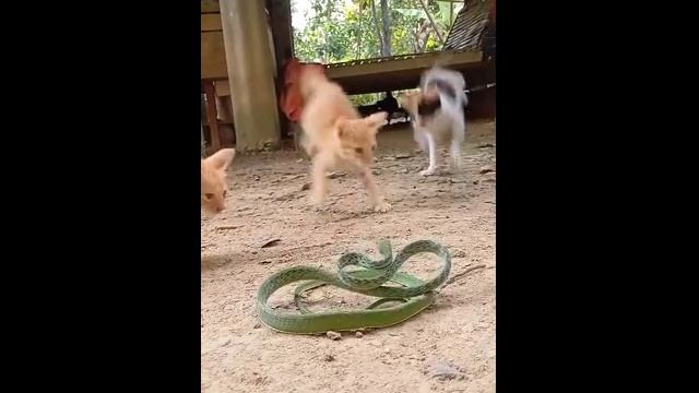 Котята первый раз увидели змею