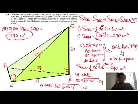 №244. Основанием пирамиды DABC является прямоугольный треугольник ABC, у которого гипотенуза АВ равна 29 см, катет АС равен 21 см. Ребро DA перпендикулярно к плоскости основания и равно 20 см. Найдите площадь боковой поверхности пирамиды. Поддержать канал рублём - 5469400944002125 (Сбербанк) Мой второй канал для подготовки к ЕГЭ и ОГЭ - https://www.youtube.com/ЕвгенийСумин Инстаграм - https://www.instagram.com/EGE_OGE.math Личный инстаграм - https://www.instagram.com/ee_sumin VK - https://vk.com/evgeniysumin FB - https://www.facebook.com/EvgeniySumin
