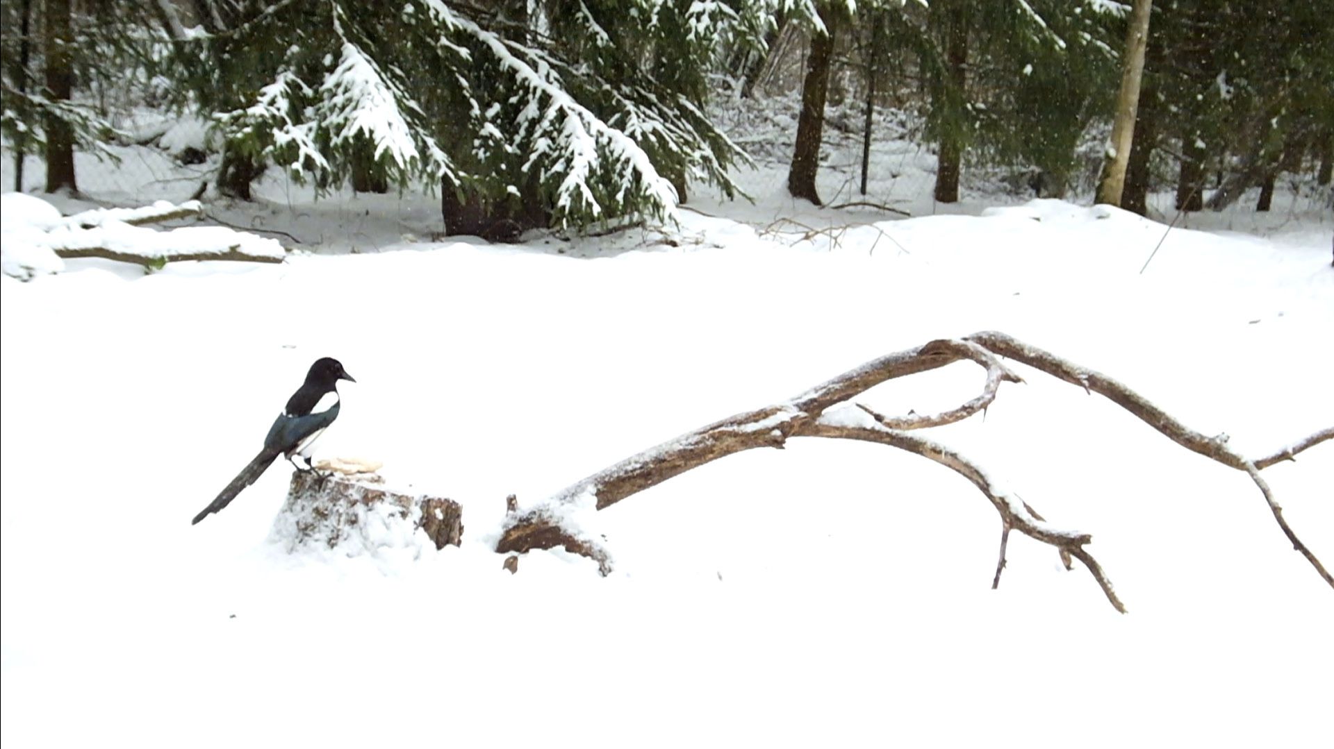 Если сороки не крупным планом и не освещены ярким солнцем, то пусть её белые перья перекликаются со снегом.