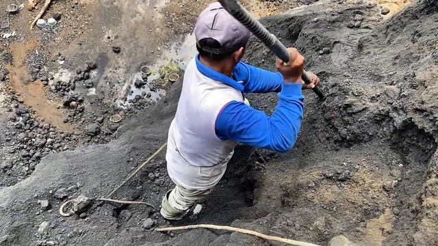 Строительство, шахтёр сбивает песок со склона