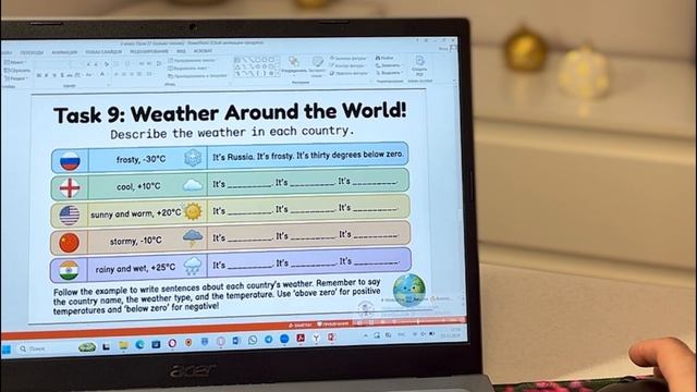 Презентация, Английский язык, 2 класс, урок № 27 “It’s windy!” Содержание: Task 1. Составь предложения о погоде, поставив слова в правильном порядке. Task 2. Подбери подписи к изображениям. Task 3. Найди 11 слов по теме «Погода». Task 4. Разгадай кроссворд по теме «Погода». Task 5. Выбери ту одежду, которую ты носишь в дождливые дни. Task 6. Заполните таблицу, распределив слова по категориям «Лето», «Осень», «Зима», «Весна». Task 7. Прочитай определения и заполни пропуски рядом с ними, используя слова rainbow, clouds, snow, sun, wind. Task 8. Восстанови разговор двух друзей, поставив предложения в правильном порядке. Task 9. Посмотри на таблицу и составь предложения по образцу. Task 10. Прочитай предложения, определи являются ли они правдой (True) или ложью (False). Task 11. Набери на клавиатуре слова. Task 12. Закончи предложения о погоде, подчеркнув подходящие по смыслу слова. Task 13. Восстанови письмо Энн другу по переписке, поставь предложения в правильном порядке. Task 14. Составь вопросы о погоде, используя данные ответы. Материал создан для комплексного решения образовательных задач в рамках одной темы: Предметные: Активное усвоение тематической лексики, развитие навыков аудирования и чтения, тренировка устной речи. Метапредметные: Развитие внимания, памяти, логического мышления и коммуникативных УУД через работу в парах и группах. Личностные: Повышение мотивации к изучению языка, создание положительной атмосферы на уроке. Учебочка.рф - платформа для преподавателей и методистов, где можно не только приобрести полезные материалы, но и разместить свои на продажу.