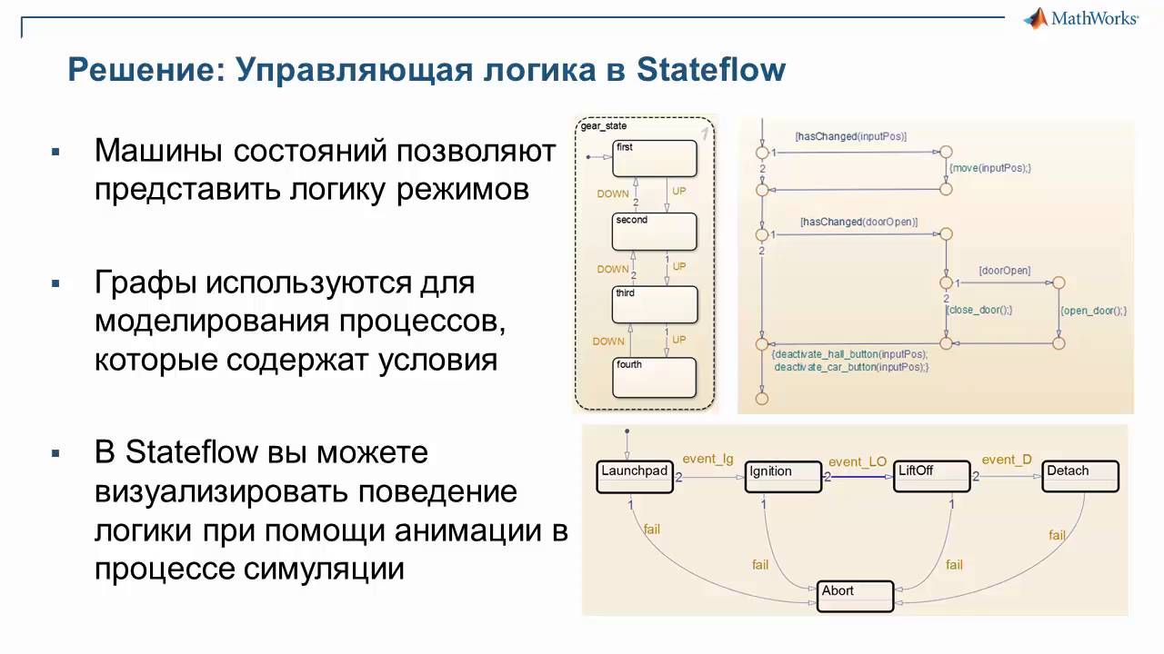 В данном видео приведен высокоуровневый обзор подходов к моделированию управляющей логики в Stateflow. Кратко сравниваются альтернативные подходы к моделированию управляющей логики (Stateflow, Simulink и код С).
