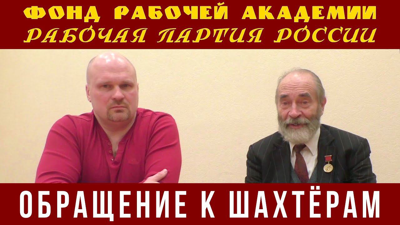 Обращение к шахтёрам. Михаил Васильевич Попов, доктор философских наук, профессор по кафедре экономики и права, президент Фонда Рабочей Академии, сопредседатель идеологической комиссии ЦК Рабочей партии России. Григорий Вячеславович Бобинов, председатель инициативного комитета первичных профсоюзных организаций и фабрично-заводских комитетов рабочих ФРА, активист профсоюза медиков «Действие». Товарищи рабочие, присылайте ваши видеоматериалы для публикации на видеоканале Фонда Рабочей Академии Рабочее ТВ главному редактору видеоканала Сергею Тюленеву на почту atypus@mail.ru Как вступить в Рабочую партию России: http://www.r-p-w.ru/kak-vstupit-v-rabochuyu-partiyu-rossii.html _______________________________________________ Для пожертвований в Фонд Рабочей Академии: Карта Сбербанк: 5469550034869302 Михаил Васильевич П. Карта Тинькофф: 5536913885040937 Кошелёк ЮMoney (Яндекс.Деньги): https://yoomoney.ru/to/410016147459036 PayPal: _________ Отчеты о поступлениях: Благодарим за поддержку работы Фонда Рабочей Академии! _______________________________________________ Рабочая партия России: http://www.r-p-w.ru Северо-Кавказское отделение РПР: https://rpw-krd.ru Балтийское отделение ФРА https://rpwbl.ru/ Красное Радио ФРА: https://www.krasnoe-radio.ru/
