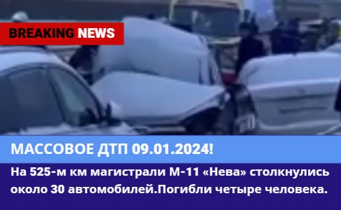 ?Нижний Новгород на 525-м км магистрали М-11 «Нева» столкнулись около 30 автомобилей. Погибли четыре человека, один из них — ребёнок. Движение в сторону Москвы на данный момент перекрыто. Объезд организован по трассе М-10. 09.01.2024