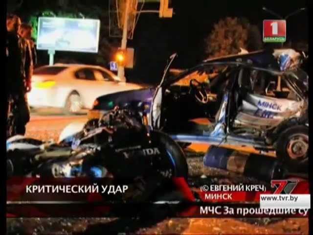 Происшествия с больших дорог у Владимира Королёва. Внезапная помеха. Ночная авария унесла жизнь минского байкера. Трагедия произошла недалеко от телецентра. Спортивный мотоцикл Honda CBR двигался по проспекту Независимости. На перекрестке с улицей Макаенка, откуда и выезжал автомобиль милиции, произошла авария. Удар был такой силы, что машину LADA развернуло на 180 градусов. По словам очевидцев, милицейская машина пересекала перекресток без работающих маячков. Левая боковая часть кузова автомобиля сильно смята, от байка мало что осталось. В результате ДТП пострадали оба милиционера, которые патрулировали улицы города, сейчас они находятся в больнице. Водитель мотоцикла погиб на месте. В деревне Ореховка Кличевского района помощь спасателей понадобилась водителю Fiat Marea. Прибывшие сотрудники МЧС обнаружили семейный автомобиль в кювете. Универсал опрокинулся на правый бок. Водитель самостоятельно выбраться из машины не смог, пришлось с помощью с помощью гидравлических ножниц разрезать крышу машины. Пострадавший получил травмы и был доставлен в местную районную больницу. В Гродно водитель Peugeot сбил пожилую женщину. Трагедия случилась ранним утром недалеко от пешеходного перехода. В результате аварии женщину отбросило на капот машины. По инерции пешеход ударился о лобовое стекло и упал на асфальт. В тяжелом состоянии ее доставили в больницу. Сейчас милиция пытается установить личность пострадавшей. Очевидцам гродненской трагедии в милиции просят откликнуться по телефону 102. В Молодечненском районе минчанин, управляя минивэном Opel Movano, врезался в дерево. Водитель "немца" неправильно выбрал безопасную скорость движения, съехал в кювет, где и совершил наезд на березу. В результате ДТП у автомобиля вмятины на капоте и разбито лобовое стекло, помята крыша. От полученных телесных повреждений мужчина скончался на месте происшествия. Двое пассажир с травмами доставлены в больницу.