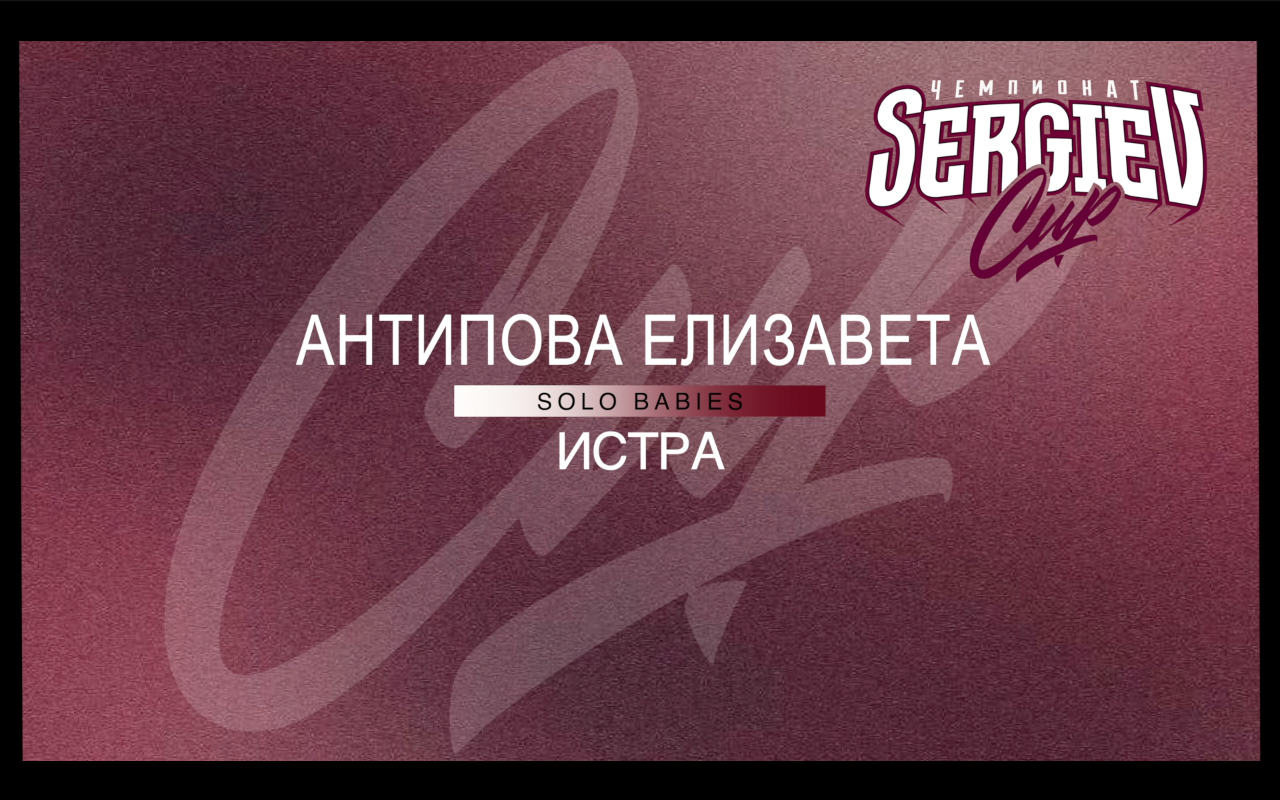 SERGIEV CUP 2024 Антипова Елизавета Номинация: Solo Категория: Babies Жюри чемпионата: Тоха Андреев Артем Соляник Артем Нефедов ОРГАНИЗАТОР МЕРОПРИЯТИЯ: TRIASH PRODUCTION Информация о предстоящих чемпионатах: Telegram : https://t.me/triash_prod ВК : https://vk.com/sergiev_cup YOUTUBE : https://www.youtube.com/channel/UCPDX3Znh7OJQqmb0v5u1MHw Дополнительная информация : +7 (916) 533-50-63