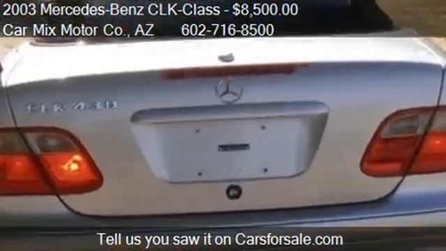 Car Mix Motor Co. 2343 W. Indian School in Phoenix, AZ 85015 Come test drive this 2003 Mercedes-Benz CLK-Class CLK430 Cabriolet for sale in Phoenix, AZ. http://www.carmixmotor.com Any credit. See what it's about,stop by or call us at Car Mix Motor Company, your source for quality used vans,cars, trucks and SUV's located in the heart of Phoenix, Arizona. Here you'll find that we treat our customers with honesty and integrity in a friendly professional car buying atmosphere. Please feel free to ask about our many extended services contracts designed to fit any budget and every need as well as a multitude of finance options suited for every customers needs. So please come by or call us where you'll always be greeted with a smile and have every question answered with honesty and integrity. Beautiful vehicles, great location and prices you can't beat! Call us at 1.877.343.3090! Disclaimer Sales Tax, Title, License Fee, Registration Fee, Dealer Documentary Fee, Finance Charges, Emission Testing Fees and Compliance Fees are additional to the advertised price. Option List:ABS Brakes,Air Conditioning,Alloy Wheels,AM/FM Radio,Anti-Brake System: 4-Wheel ABS,Automatic Headlights,Body Style: CONVERTIBLE 2-DR,Cargo Area Cover,Cargo Volume: 9.50 cu.ft.,Cassette Player,Cruise Control,Curb Weight-automatic: 3665 lbs,Deep Tinted Glass,Driver Airbag,Driver Multi-Adjustable Power Seat,Electrochromic Exterior Rearview Mirror,Electrochromic Interior Rearview Mirror,Electronic Brake Assistance,Engine Type: 4.3L V8 DOHC 32V,Fog Lights,Front Air Dam,Front Brake Type: Disc,Front Headroom: 37.50 in.,Front Hip Room: 53.70 in.,Front Legroom: 41.90 in.,Front Power Memory Seat,Front Shoulder Room: 52.70 in.,Front Side Airbag,Front Spring Type: Coil,Front Suspension: Ind,Fuel Economy-city: 17 miles/gallon,Fuel Economy-highway: 24 miles/gallon,Full Size Spare Tire,Genuine Wood Trim,Glass Rear Window on Convertible,Heated Exterior Mirror,Interval Wipers,Keyless Entry,Leather Seat,Leather Steering Wheel,Overall Height: 54.30 in.,Overall Length: 180.20 in.,Overall Width: 67.80 in.,Passenger Airbag,Passenger Multi-Adjustable Power Seat,Passenger Volume: 75.80 cu.ft.,Power Adjustable Exterior Mirror,Power Door Locks,Power Windows,Rear Brake Type: Disc,Rear Headroom: 36.50 in.,Rear Hip Room: 44.20 in.,Rear Legroom: 27.40 in.,Rear Shoulder Room: 48.00 in.,Rear Spring Type: Coil,Rear Suspension: Ind,Rear Window Defogger,Removable Top,Separate Driver/Front Passenger Climate Controls,Standard Seating: 4,Steering Type: Recirc,Steering Wheel Mounted Controls,Subwoofer,Tachometer,Tank: 16.40 gallon,Telematics System,Telescopic Steering Column,Tilt Steering,Tires: 225/45R17,Track Front: 59.30 in.,Track Rear: 58.00 in.,Traction Control,Trip Computer,Trunk Anti-Trap Device,Turning Diameter: 35.10 in.,Vehicle Anti-Theft,Vehicle Stability Control System,Wheelbase: 105.90 in.,Wind Deflector for Convertibles Provided by Carsforsale.com http://video.carsforsale.com/vehiclevideo.aspx?vid=166874997