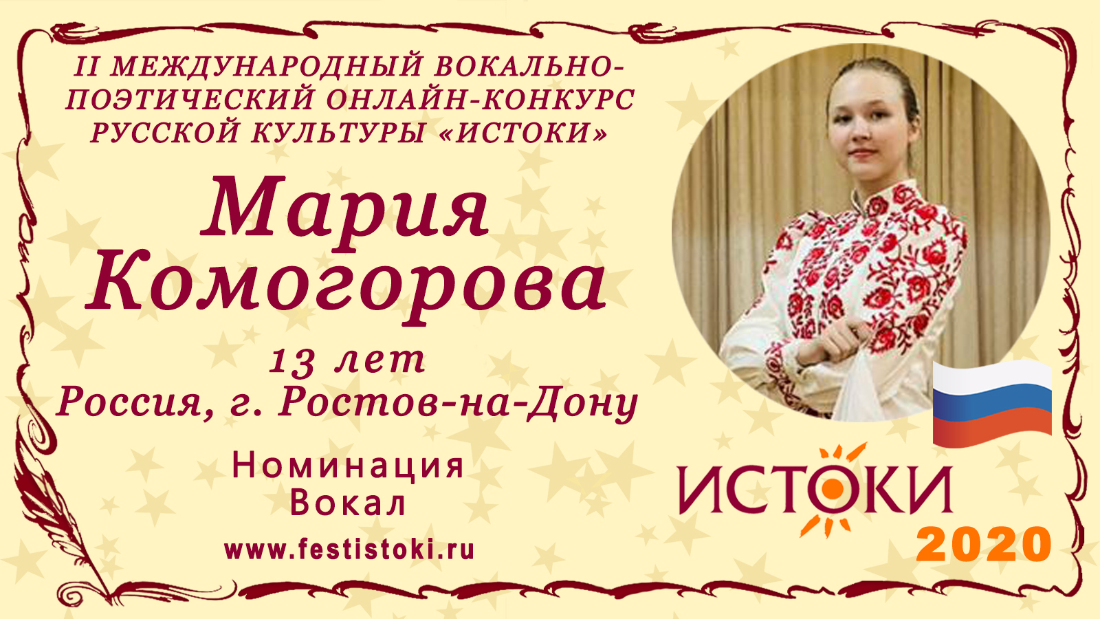 Лауреат II степени II Международного вокально-поэтического онлайн-конкурса русской культуры «Истоки». Номинация - Вокал. Песня "Ты мне нитки не мотай". музыка и слова А. и Г. Заволокиных Сайт: www.festistoki.ru / www.festistoki.com E-mail: festistoki@mail.ru