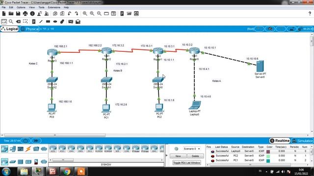 Cara Menghubungkan 3 Kelas Ip Addres Dengan 1 Server,4 Router,3 Switch,4 Enddevice.