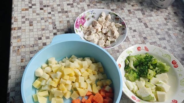 Куриную грудку отвариваем заранее, бульон от неё не используем.Кабачок, брокколи, картофель, морковь, грудку, нарезаем удобной вам формой. лук отвариваем целым, затем его извлекаем. Картофель и морковь отвариваем минут 10 затем добавляем кабачок, брокколи и грудку варим до готовности.Далее добавляем вермишель варим 3 минуты и суп готов. Вермишель -50 гр кабачок- ~100-120 гр брокколи-~80 гр грудка-~140 гр морковь 1 шт картофель-4 шт. соль по вкусу, ориентируясь на количество которая допускает ваша диета. Это примерное количество продуктов которые я потратила. Вы можете взять в любых пропорциях.
