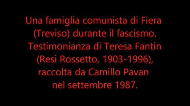 Trascrizione integrale su https://miscellanea-camillo-pavan.blogspot.it/2016/07/teresa.fantin-resi.rossetto-comunista.fiera.treviso.html Testimonianza di Teresa Fantin, 1903-1996, moglie di Sante Rossetto (scaricatore al porto di Fiera e pescatore), conosciuta come "Resi Rossetto", tessera del PCI dal 1924. Intervista registrata nel settembre 1987 nella sua abitazione in via Alzaia. Lingua parlata: dialetto veneto di Treviso. Registrazione di Camillo Pavan PRINCIPALI ARGOMENTI 00:20 Nomi e soprannomi dei quattro fratelli Rossetto, antifascisti di Fiera, figli di Giovanni Rossetto (Nane Busarona), “peota” (pilota fluviale) originario di Meolo: Antonio, del 1893; Giovanni (Pompilio), del 1896; Sante (Gigi), del 1898; e Emilio (Dante) del 1903. 02:52 Il padre dei fratelli Rossetto era semianalfabeta. Abitava a Meolo, e doveva andar militare. Volevano che si pagasse il viaggio. «No, ha detto, che non mi pago il viaggio. Se volete che vada a fare il militare, pagatemelo voi». I carabinieri vanno a prenderlo per portarlo in prigione, e lui prende i carabinieri e li butta nel fiume Meolo. Sua importanza nell’educazione politica dei figli. 04:09 Nel 1926, con le leggi eccezionali del fascismo, Giovanni (Pompilio) e Sante (Gigi) Rossetto sono mandati al confino. Dapprima alle Tremiti, poi a Ustica e a Lipari. Nel frattempo il fratello più giovane Emilio (Dante) è espatriato in Francia, da dove nel 1938 si reca in Spagna a combattere nelle brigate internazionali contro Franco 05:55 Condizioni di vita della famiglia Rossetto a Fiera, con il padre al confino. 07:09 Teresa continua a lavorare da Saterini, «su ‘e strasse» (in un centro di raccolta di stracci e altri materiali di recupero). 08:11 Contrasti e lotte con la questura e i carabinieri che non le riconoscono il suo stato di indigenza e l’impossibilità di mantenere i tre figli che all’epoca Teresa aveva. 10:04 Finalmente riesce a ricevere un sussidio e, con quei soldi si reca a Lipari a raggiungere il marito al confino. Condizioni di vita al confino. Rapporti con gli abitanti del luogo. 11:39 «- Come vivevate, come mangiavate, cosa facevate? Gli davano “la mazzetta”, dieci lire al giorno». Inoltre il marito e il cognato (che sa fare il falegname) si arrangiano con qualche lavoretto. Resi ritorna a Fiera nel 1929/30 e riprende la battaglia con le autorità per vedersi riconoscere il diritto alla sopravvivenza. 13:52 Nel 1932 ritornano a Fiera anche i due fratelli confinati. Riprendono a lavorare dapprima come facchini, poi, mancando il lavoro si costruiscono un batèo [barca da fiume], fanno i pescatori nel Sile, e vanno a vendere il pesce per le case. 15:03 Resi: la sua prima tessera del partito comunista è del 1924. «E quando sono andata a lavorare ho condotto una battaglia del lavoro per le otto ore». 15:56 Il bagno sul Limbraga. Uno dei figli di Resi, Wladimiro, va nuotare sul Limbraga con altri ragazzi. Lo vede il maresciallo dei carabinieri di Fiera il quale, saputo che è un Rossetto, lo apostrofa: «Ah, ti si vede nella faccia!». Reazione di Resi. 17:19 La casa del fascista. Il proprietario della casa dove abitano i Rossetto “dicevano che era un fascista di Santa Lucia di Piave”: Antonio Camarotto, titolare di un negozio di stoffe. Un giorno viene per riscuotere l’affitto. «Ci ha trovati d’inverno, senza fuoco, senza niente. È andato via, e per dieci mesi non ha voluto l’affitto». 18:25 Dopo la guerra, Camarotto insiste per vendere loro la casa, cedendogliela a un prezzo di gran lunga inferiore a quello di mercato. «Ma vuole che non ringrazi quest’uomo qua»? *** Antifascisti a Treviso durante il fascismo; socialisti e comunisti del sobborgo fluviale di Fiera; comunisti al confino alle Tremiti, a Ustica e Lipari. Fiera, quartiere di Treviso, antifascismo