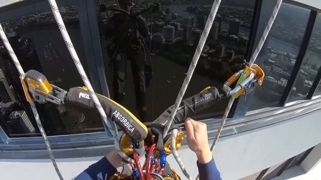 Cleaning windows via a rope transfer on top of a skyscraper. About the Building : Riparian Plaza is a 53-storey skyscraper located in the central business district of Brisbane, Queensland, Australia. The building stands at 250 m (820 ft) in height to its communications spire and 200 m (660 ft) to its roof. It was Brisbane's tallest building until it was surpassed by Aurora in 2006 and is a particularly iconic building on the Brisbane skyline. (Wikipedia)