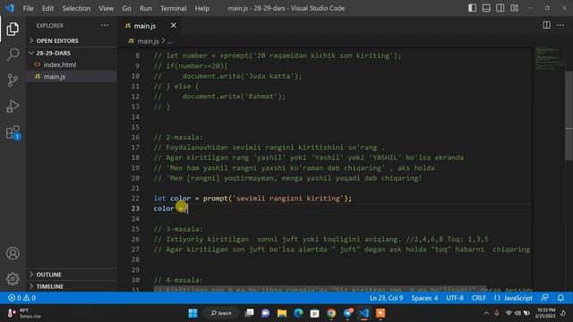 29-dars. JS Amaliyot ! | Masalalar javobi | Javascript (JS) darslari 0 dan | alicoder | alicoder.uz