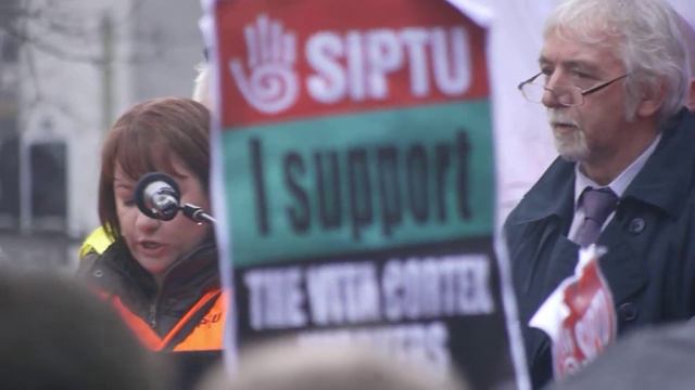 On Day 58, Martina Anderson, Vita Cortex worker, explains about the occupation of the plant and the current situation facing the workers, to a crowd of over 5000 marchers at a support rally in Cork city.