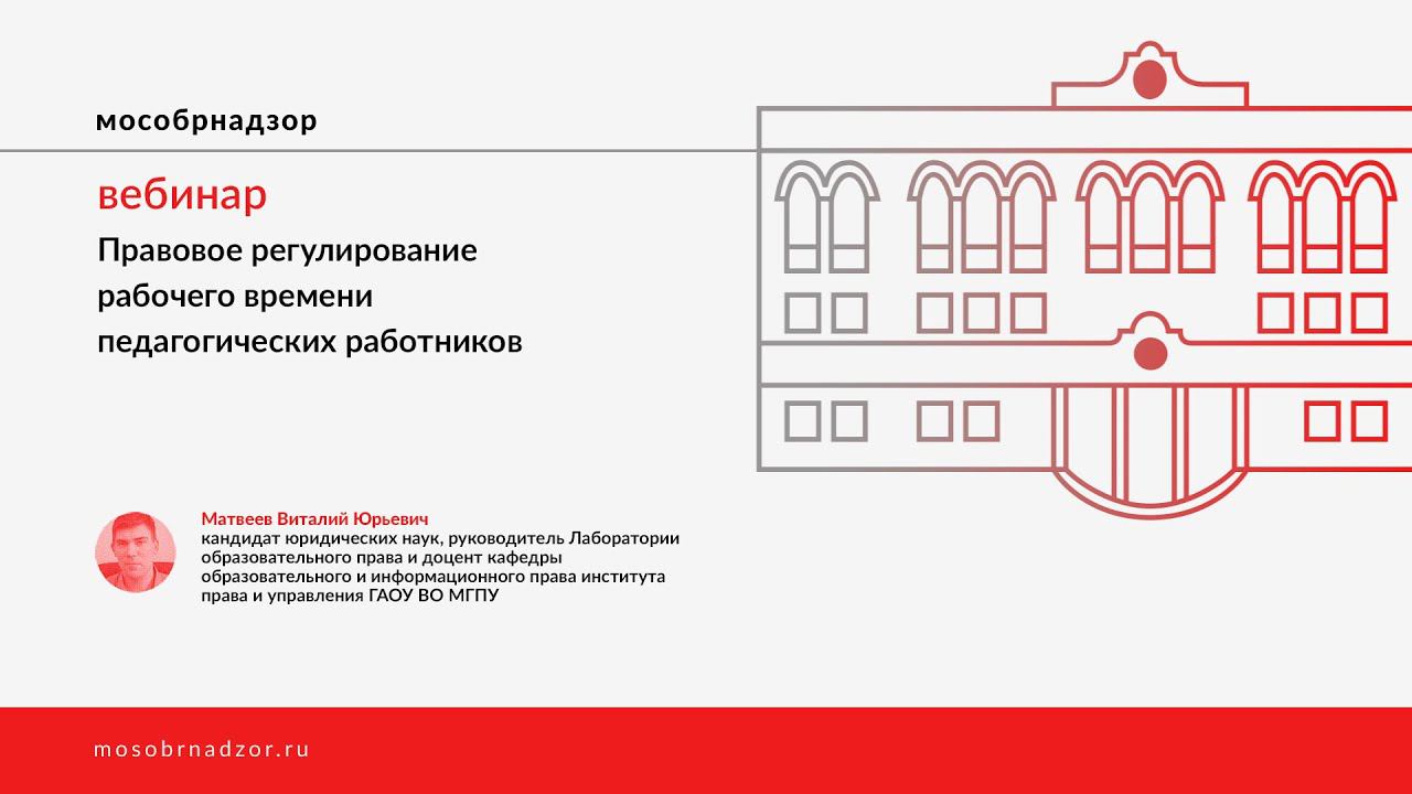 На вебинаре рассмотрены основные нормативные правовые акты, регламентирующие рабочее время педагогических работников. Охарактеризованы требования к объему педагогической работы и иных видов работ педагогических работников, а также особенности совместительства и совмещения. Ведущий вебинара - Матвеев В.Ю. Страница вебинара на сайте проекта - http://mosobrnadzor.ru/prevention/webinars/2021-02-23_11-00