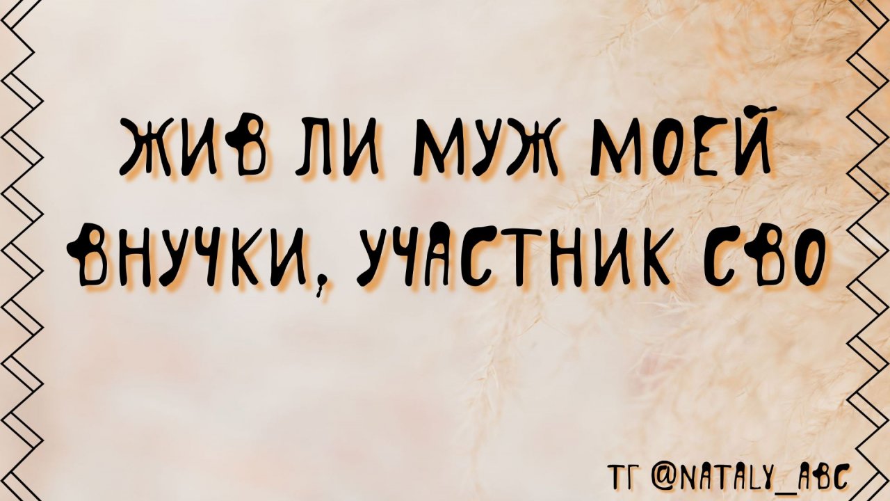 🤔 Ваши вопросы - мои ответы! 💬 Вопрос: Супруг моей внучки контрактник СВО, последний звонок от него был 22.03.2025 г. Считается без вести пропавшим. Женщина по картам сообщила, что его нет ни в мире живых и в другом мире не видно. Жив наш воин? _______ Для связи телеграмм @nataly_abc Канал Таро Психология, оккультное https://t.me/AstroTarologY1 Канал Астрологии https://t.me/AstroTarologY С наилучшими пожеланиями, Наталья 🫰 #астролог #таро #сво #потерялсячеловек #безвестипропавший #пропалбезвести #живлисолдат