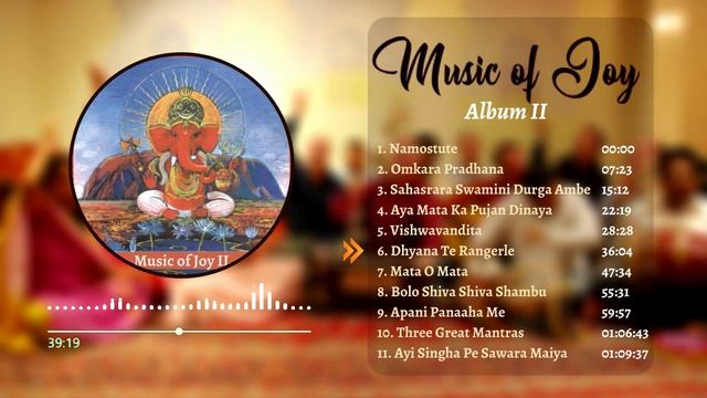 00:00 - Namostute 07:23 - Omkara Pradhana 15:12 - Sahasrara Swamini Durga Ambe 22:19 - Aya Mata Ka Pujan Dinaya 28:28 - Vishwavandita 36:04 - Dhyana Te Rangerle 47:34 - Mata O Mata 55:31 - Bolo Shiva Shiva Shambu 59:57 - Apani Panaaha Me 01:06:43 - Three Great Mantras 01:09:37 - Ayi Singha Pe Sawara Maiya О группе - Music of Joy - это уникальная многокультурная группа, базирующаяся в Сиднее, Австралия. Магия группы происходит от динамической энергии, производимой, когда более двадцати музыкантов с широким спектром культурных слоев объединения с одной общей целью - делиться музыкой, которая является радостной и вдохновляющей. Репертуар группы такой же обширный и разнообразный, как и ее члены, превосходятся на культурные границы и начиная от традиционных индийских бхаджанов до мелодичных китайских и русских народных песен, а также ритмичных африканских гармоний и, конечно, музыки самой Австралии. Музыка радости претерпела постоянную трансформацию с момента ее создания более двадцати лет назад. Диапазон вокальных стилей и инструментов отражает разнообразие группы, и их база в Австралии привели к растущему числу оригинальных композиций и стилей слияния, отражающих мультикультурный характер Австралии. С диджериду и надежной перкуссией и ритм -секцией, включая табла, Дхолак, Джамбе и Чимта, у Moj Sound действительно очень твердый «бас»! Добавьте саксофон, кларнет, флейту, гитару и гармонию, и результат является возвышенным. Будь то быстрый и ритмичный или спокойный и медитативный, единственная константа - это радость музыки, и эта радость - это то, что объединяет и мотивирует музыкантов. Участники группы собрались вместе благодаря своей практике медитации Сахаджа Йоги, которая вдохновляет их и подкрепляет их желание поделиться радостью со своей аудиторией. Music of Joy много гастролировала как на местном, так и за рубежом и записала пять альбомов - совсем недавно двойной компакт -диск, «Flow of Love». Прошлые зарубежные туры включают Китай, Японию, Индию, Малайзию, Филиппины, Тайвань, Вьетнам, Новую Каледонию и Новую Зеландию. Группа также выступила на многочисленных национальных фестивалях и специальных мероприятиях, в том числе: фестиваль зимней магии в Катумбе; Канберра Флория и мультикультурные фестивали; Вудфордский народный фестиваль; Культурный фестиваль в Таунсвилле и в павильоне Бонди в Сиднее.