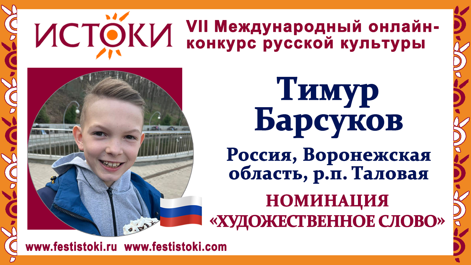 Тимур Барсуков, 11 лет. Россия, Воронежская область, р.п. Таловая. "Я себя не мыслю без России"
