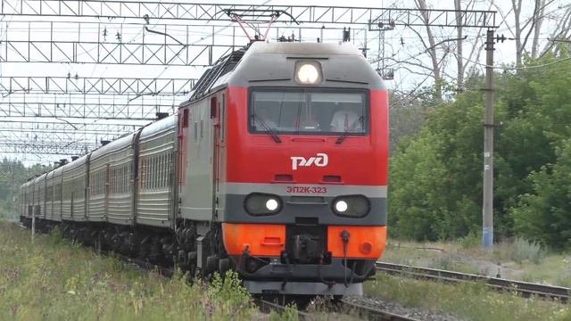 Электровоз ЭП2К-323 с пассажирским поездом №332 Уфа — Новый Уренгой следует через бывшую станцию Сосновка, ныне о.п. Сосновка, перегон Каменск-Уральский - Богданович. Свердловская Ж.Д. Свердловская область. Россия. Приписка: ТЧЭ-3 Барабинск. 01.07.2021