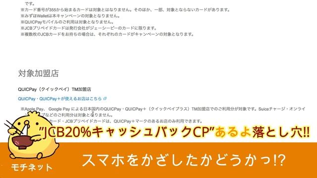 JCBのスマホ決済キャンペーンはその字のごとく「実店舗にてスマホを利用して」じゃ無いとキャッシュバックの対象になりません。 ネット決済でApplePayやGoogle Payを利用しても対象外です。 プリカやモバイルsuicaへのチャージなども対象外なのでチェックしておきましょう! ▼チャンネル登録よろしくお願いします。 ⇒http://www.youtube.com/channel/UCk3lRoZq2c9TfoXtZ_J0GwQ?sub_confirmation=1 ▼モチネットTwitter https://twitter.com/mochinet1 ▼JCBザクラスが欲しい!ブログ https://cue-top.com/ 関連動画 ▼JCBの20%キャッシュバックキャンペーンが始まった!最大1万円 https://www.youtube.com/watch?v=pI2EebQzg9s&feature=youtu.be ▼JCBでスマホ決済20%キャッシュバックキャンペーンを解説!複数の対象カードで参加可能・JCBプリペイドカードも対象に?8/16開始 https://www.youtube.com/watch?v=48KFdP0PWBM ▼JCBカード1枚につき20%キャッシュバックキャンペーンがアツい https://www.youtube.com/watch?v=_eX-d2kWXSY&t=55s ▼【1万円】JCBでスマホ決済!全員に20%キャッシュバックキャンペーン!【対象カードに注意】 https://www.youtube.com/watch?v=xd8K9DrRwUo ▼JCBでスマホ決済!全員に20%キャッシュバックキャンペーン開催! https://www.youtube.com/watch?v=g7TNgBEz-TE ▼JCBでスマホ決済!20%キャッシュバックの対象カード・対象外カードは? https://www.youtube.com/watch?v=_AvQk31ILu8 ▼【何枚でもOK】JCBクレカ1枚につき最大10,000円のキャッシュバック https://www.youtube.com/watch?v=sVaD735a1bA #JCB #キャッシュバック #キャンペーン