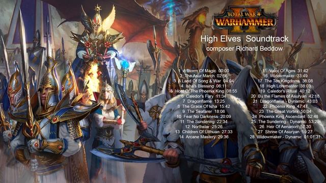 00:00 A Storm Of Magic 02:56 The Asur March 04:04 A Land Of Song & War 06:11 Isha's Blessing 08:55 Host Of The Phoenix King 11:34 Caledor's Fury 13:25 Dragonflame 15:42 The Grace Of Isha 18:06 The Seafarer 20:09 Fear No Darkness 22:34 The Sundering 25:26 Northstar 27:33 Children Of Ulthuan 29:36 Arcane Mastery 31:42 Valor Of Ages 33:49 Widowmaker 36:08 The Ten Kingdoms 38:03 High Loremaster 40:12 Caledor's Ritual 42:18 By the Flames of Asuryan 43:03 Dragonflame - Dynamic 47:47 Phoenix King 50:04 The Great Vortex 52:48 Phoenix King Ascendant 53:29 The Sundering - Dynamic 57:30 Heir Of Aenarion 59:27 Shrine Of Asuryan
