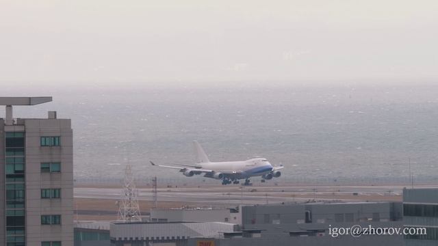 26 января 2025 года, аэропорт Чек Лап Кок (HKG/VHHH), Гонконг. Boeing 747-409F HL7646 авиакомпании Asiana Airlines приземляется на ВПП 07R. Самолёту почти 23 года, первый полёт 15 сентября 2002 года. Первый эксплуатант - тайваньская авиакомпания China Airlines (B-18711, с 24 сентября 2002 года по 28 мая 2024 года). С 14 октября 2024 года в составе флота южно-корейской авиакомпании Asiana Airlines (HL7646). В настоящее время в процессе передачи во флот другой южно-корейской авиакомпании Air Incheon. * Boeing 747 of Asiana Cargo landing at International airport in Hong Kong HONG KONG - JANUARY 26, 2025: Heavy aircraft Boeing 747 of Asiana Cargo landing at Chek Lap Kok airport, Hong Kong, side view. Jumbo jet arriving. #Asiana,#AsianaCargo,#AirIncheon,#ChinaAirlines,#HongKong #ChekLapKok,#Boeing747,#JumboJet,#spotting,#Гонконг