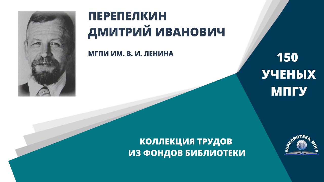 О научной и педагогической деятельности профессора Перепелкина Д. И. рассказывает доцент Кафедры геометрии имени Левона Сергеевича Атанасяна Института математики и информатики МПГУ, кандидат физико-математических наук Игнаточкина Л. А. Создатели проекта: авторы идеи – Лиханова И. В., директор библиотеки МПГУ, Свирина М. Н., заведующий информационно-справочной службой библиотеки МПГУ; подготовка материалов – Курицина Т. В., заведующий отделом библиотеки; текст за кадром, монтаж – Климова А. А., главный библиотекарь. Вопросы о доступности изданий из фонда Библиотеки МПГУ Вы можете направить на почту: lib_ms@mpgu.su . Адреса отделов Библиотеки МПГУ Вы можете посмотреть, перейдя по ссылке: http://mpgu.su/ob-mpgu/struktura/biblioteka/struktura/ . #МПГУ #150ЛетМПГУ #ЮбилейМПГУ #Ученые #Перепелкин