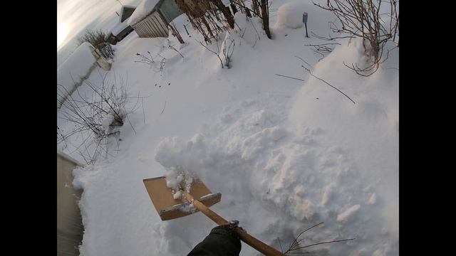 Не было снега и пошёл.Откапываю теплицы в саду.
