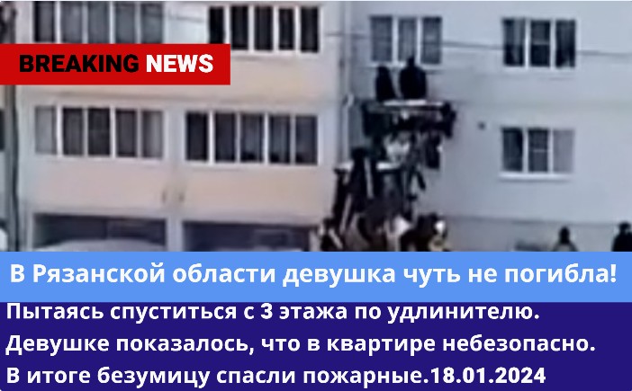 В Рязанской области девушка чуть не погибла, пытаясь спуститься с 3 этажа по удлинитель. 18.01.2024