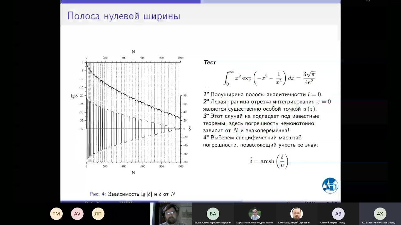 https://events.rudn.ru/event/133/ Presentation of the theses performed under the guidance of as. prof. Belov A.A. in the Moscow State University Khokhlachev Valentin Sergeevich. Improved error estimates for exponentially convergent quadratures For some important classes of integrand functions, the quadrature trapezoid formula has exponential convergence instead of power-law one. For this case, majorant Trefethen-Weidemann estimates of accuracy are known. We improve the majorant constant noticeably. We show that the Trefethen-Weidemann estimates are applicable only for integrand functions with first-order poles. Heuristic accuracy estimates for the poles of integer order are proposed. Tintul Maxim Alexandrovich. Multidimensional cubatures on the Sobol sequences The shifted Sobol points are proposed for calculating multidimensional cubatures by the Monte Carlo method. This modification increases the uniformity of the points distribution. A multigrid calculation strategy is proposed to find a posteriori statistical accuracy estimate. This significantly increases the robustness of the calculation. Zverev Alexey Andreevich. Bicompact difference schemes for one-dimensional quantum mechanical problems A bicompact difference scheme is constructed for quantum-mechanical problems with discrete spectrums. This is a two-point conservative scheme. If the special meshes are applied, the scheme provides the second order of accuracy for non-smooth and even discontinuous potentials. Therefore, the bicompact scheme is radically superior in accuracy to traditional three-point schemes. Vergazov Artem Sergeevich. Accuracy control for numerical integration of stiff systems Automatic step selection algorithms are widely used for numerical integration of stiff Cauchy problems for ODEs. The method of geometrically adaptive meshes is the most reliable technique. We construct a new test problem, in which the exact solution is presented in terms of elementary functions of both time and the arc length of the integral curve. A quantitative comparison of various difference schemes is carried out. A new strategy for the thickening of geometrically adaptive meshes is proposed, which increases the reliability of the calculation while preserving high accuracy. Topor Oleg Igorevich. Filling the database on reaction rates to control chemical and thermonuclear reactors The most reliable data on the rates of chemical and thermonuclear reactions are obtained by regression of the results of direct experimental measurements. Using the latest mathematical methods, we construct a database on the rates of a) thermonuclear reactions which are the most important in the problem of controlled thermonuclear fusion, and b) chemical reactions of thermal decomposition of ethane. Statistically reliable estimates of confidence intervals are found for the approximating curves.