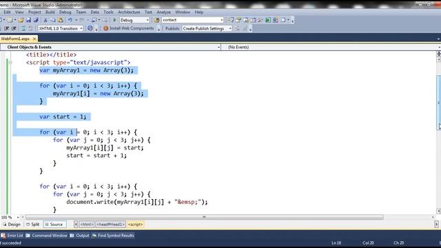 Link for all dot net and sql server video tutorial playlists http://www.youtube.com/user/kudvenkat/playlists Link for slides, code samples and text version of the video http://csharp-video-tutorials.blogspot.com/2014/12/creating-two-dimensional-array-in.html Healthy diet is very important both for the body and mind. If you like Aarvi Kitchen recipes, please support by sharing, subscribing and liking our YouTube channel. Hope you can help. https://www.youtube.com/channel/UC7sEwIXM_YfAMyonQCrGfWA/?sub_confirmation=1 JavaScript does not have a special syntax for creating multidimensional arrays. Instead we create an array of arrays. Example : The following JavaScript code creates a 2 dimensional 3x3 array var myArray1 = new Array(3) for (i=0; i [ 3; i++) myArray1[i]=new Array(3) myArray1[0][0] = "1" myArray1[0][1] = "2" myArray1[0][2] = "3" myArray1[1][0] = "4" myArray1[1][1] = "5" myArray1[1][2] = "6" myArray1[2][0] = "7" myArray1[2][1] = "8" myArray1[2][2] = "9" for (var i = 0; i [ 3; i++) { for (var j = 0; j [ 3; j++) { document.write(myArray1[i][j] + " "); } document.write("[br/]"); } In Example 1, we have manually populated each storage location in the array. Instead we can use to 2 nested for loops as shown below. var myArray1 = new Array(3) for (i=0; i [ 3; i++) myArray1[i]=new Array(3) var start = 1; for (var i = 0; i [ 3; i++) { for (var j = 0; j [ 3; j++) { myArray1[i][j] = start; start = start + 1; } } for (var i = 0; i [ 3; i++) { for (var j = 0; j [ 3; j++) { document.write(myArray1[i][j] + " "); } document.write("[br/]"); } Performing addition between 2 two dimensional arrays in JavaScript Example : The first 3 x 3 array should contain numbers from 1 to 9 The second 3 x 3 array should contain numbers from 9 to 1 The numbers present at each index position in the first and second array should be added and the result should be stored in a third 3x3 array. // Create the first 2 dimensional 3 X 3 array var myArray1 = new Array(3) for (i=0; i [ 3; i++) myArray1[i]=new Array(3) var start = 1; for (var i = 0; i [ 3; i++) { for (var j = 0; j [ 3; j++) { myArray1[i][j] = start; start = start + 1; } } for (var i = 0; i [ 3; i++) { for (var j = 0; j [ 3; j++) { document.write(myArray1[i][j] + " "); } document.write("[br/]"); } document.write("[br/]"); document.write(" +"); document.write("[br/]"); document.write("[br/]"); // Create the second 2 dimensional 3 X 3 array var myArray2 = new Array(3) for (i = 0; i [ 3; i++) myArray2[i] = new Array(3) for (var i = 0; i [ 3; i++) { for (var j = 0; j [ 3; j++) { start = start - 1; myArray2[i][j] = start; } } for (var i = 0; i [ 3; i++) { for (var j = 0; j [ 3; j++) { document.write(myArray2[i][j] + " "); } document.write("[br/]"); } document.write("[br/]"); document.write(" ="); document.write("[br/]"); document.write("[br/]"); // Create the third 2 dimensional 3 X 3 array var myArray3 = new Array(3) for (i = 0; i [ 3; i++) myArray3[i] = new Array(3) for (var i = 0; i [ 3; i++) { for (var j = 0; j [ 3; j++) { myArray3[i][j] = myArray1[i][j] + myArray2[i][j]; } } for (var i = 0; i [ 3; i++) { for (var j = 0; j [ 3; j++) { document.write(myArray3[i][j] + " "); } document.write("[br/]"); } Creating a 2 dimensional 3 X 5 array var myArray1 = new Array(3) for (i=0; i [ 3; i++) myArray1[i]=new Array(5) var start = 101; for (var i = 0; i [ 3; i++) { for (var j = 0; j [ 5; j++) { myArray1[i][j] = start; start = start + 1; } } for (var i = 0; i [ 3; i++) { for (var j = 0; j [ 5; j++) { document.write(myArray1[i][j] + " "); } document.write("[br/]"); }