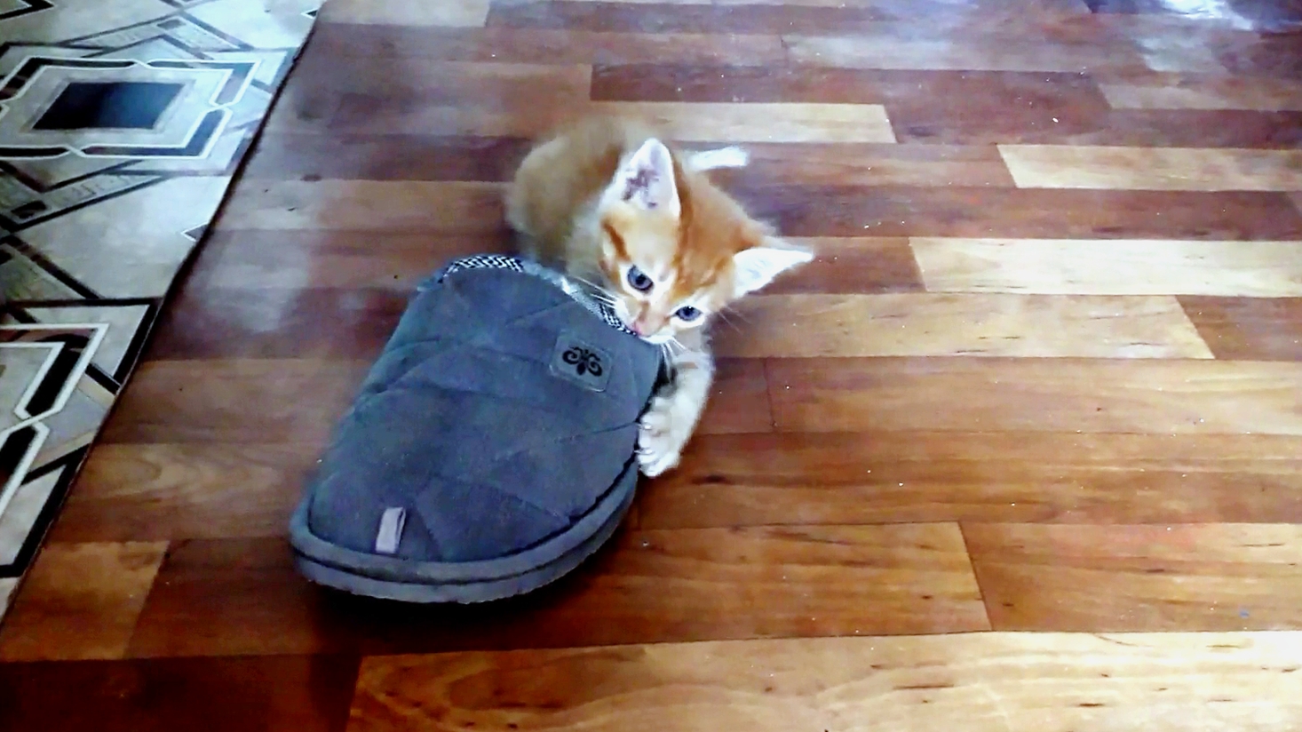 Котенок хочет надеть тапочку.