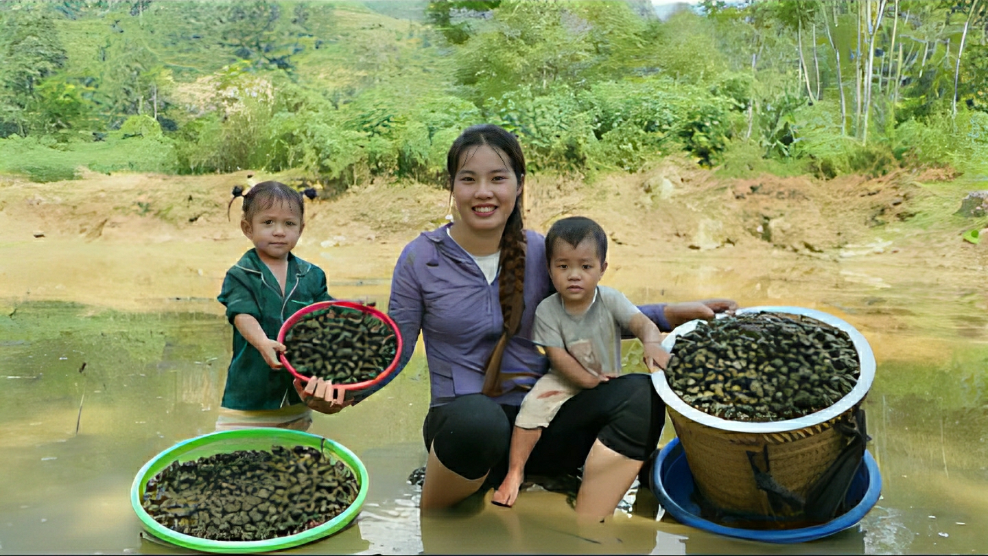 Собираю большие грязевые улитки для продажи на рынке. Купаю свою маленькую дочь. Жизнь во Вьетнаме