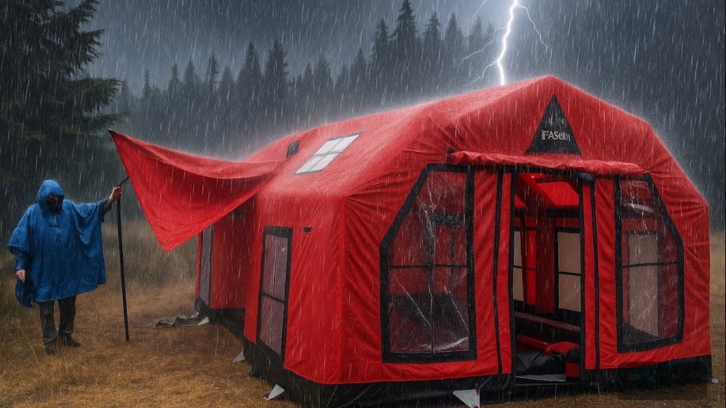 Кемпинг в грозу в новой надувной палатке.