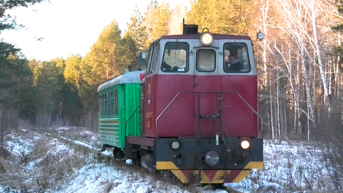 Тепловоз ТУ7-2388 с туристическим поездом "Императорский маршрут" №6 Синячиха - Алапаевск-2 следует по перегону Синячиха - Красная-2. Алапаевская узкоколейная железная дорога. Свердловская область, Россия. Приписка: ОАО "Алапаевсклес". 18.11.2023