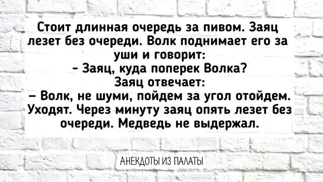Сборник Смешных Анекдотов ! Выпуск 18 00:02 Возвращение жены из отпуска • Жена вернулась с отпуска с множеством фотографий. • Показывает мужу фотографии подруг, включая Лену, которая не ночевала в санатории и была с разными мужчинами. 00:22 Встреча мужа с любовницей • Муж встречается с любовницей, которая показывает ему фотографии. • Среди фотографий — Таня, которая всегда была с мужем и не ходила на развлечения без него. 00:49 Загадка от Вовочки • Учительница загадывает загадку, ученик отвечает неправильно. • Вовочка задаёт вопрос: «Что за слово состоит из трёх букв, и вы его в руках держите?» • Учительница выгоняет Вовочку из класса, но признаёт его ход мысли. 01:17 Заяц в очереди за пивом • Заяц пытается пройти без очереди, его останавливают волк, медведь и лев. • Каждый раз заяц предлагает отойти за угол, чтобы продолжить очередь. • В конце концов, заяц встречает змея Горыныча, который спрашивает, когда будет пиво. 02:04 Мужик на кладбище • Мужик просыпается на кладбище рано утром и пытается напугать могильщика. • Могильщик не реагирует, мужик уходит. • У калитки могильщик догоняет мужика, бьёт его лопатой и предупреждает не выходить за территорию кладбища.