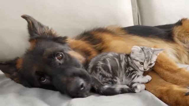 Котенок подружился с немецкой овчаркой
