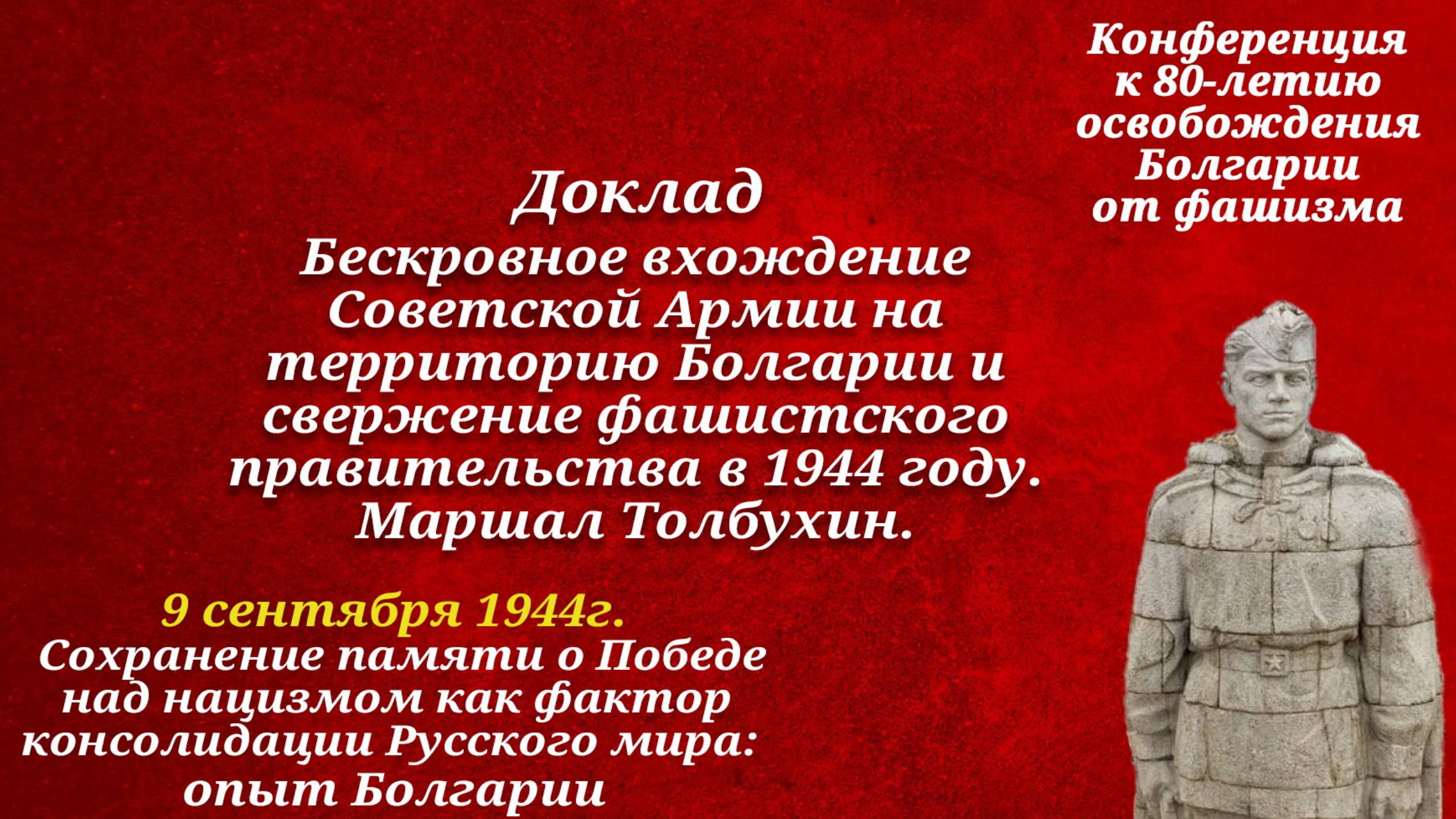 Конференция к 80-летию освобождения Болгарии от фашизма. 9 сентября 1944г. Сохранение памяти о Победе над нацизмом как фактор консолидации Русского мира: опыт Болгарии. В этом видео Доклад Михаила Кебрикова, кандидата исторических наук, доцента кафедры общей истории Ярославского государственного педагогического университета. Бескровное вхождение Советской Армии на территорию Болгарии и свержение фашистского правительства в 1944 году. Маршал Толбухин.