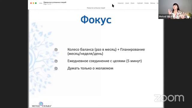 https://metodsilva.ru/anketa_2023v В этом видео Ирина Хайтин-Хлимоненко рассказывает о том, как держать фокус на цели. Для того, чтобы развивать фокус, одна из важных составляющих - колесо баланса. Колесо баланса позволяет вам увидеть всю картину. Где я сейчас нахожусь? С какой областью мне сейчас нужно поработать, чтобы через 10 лет оказаться там, где я хочу. Я рекомендую делать колесо баланса раз в месяц, оценивать области, на которых вам сейчас нужно сфокусироваться. Берёте основные сферы жизни, например: здоровье, финансы, карьера, отношения и оцениваете эти области от 1 до 10. Где 1 - я недовольна этой областью, 10 - просто замечательно. И выбираете максимум три области, которые больше всего проседают. Если это, например, карьера, финансы и здоровье, то вы выбираете по каждой из этих областей привычку или действие, которые вам нужно выполнять регулярно (ежемесячно, еженедельно, ежедневно) в зависимости от того, какую вы привычку выберете, чтобы улучшить эту область. Итак, выберите 1-3 области и обязательно планируйте действия, привычки, которые помогут повысить оценку в этой области. Через месяц, вы снова оцениваете себя. И, исходя из того, какие области вы выбрали, например, вы взяли здоровье и для здоровья выбрали, делать ежедневную зарядку, тогда вы планируете свою неделю и пишите: 7:00 - 7:15 - зарядка. И, предположим, я хочу работать с отношениями с детьми, значит, два раза в неделю, к примеру, смотрю с ними мультфильм. И планируете это время. Со временем будет проще, но начинать нужно именно с планирования. Как мы обычно делаем? Я сейчас пойду на работу, отпашу 10-12 часов, а потом, если у меня останутся силы и желание, тогда, может быть, займусь собой. Нет! Записали время под себя, вот здесь у меня баня, вот здесь у меня массаж, потому что я хочу заботиться о своём здоровье, вот здесь у меня изучение нового профессионального навыка, потому что я хочу расти по карьерной лестнице, и так далее. Зафиксировали эти основные блоки и придерживаетесь плана. Конечно, что-то может пойти не так, например, я вчера не попала на массаж потому, что у меня дома случился форс-мажор. Ничего страшного. Я написала, что не смогу сегодня прийти. Понимаете? Когда у вас есть структура вашего дня и туда занесены особенно важные области для вас, с которыми вы хотите работать, то никто за вас это время не найдёт. И планирование, на самом деле, даёт гибкость вашему графику. Вы заметите, когда вы чётко знаете, что, за чем идёт, у вас освобождается дополнительное время. Потому что вам не надо думать, во сколько мне на тренировку или во сколько мне этим заниматься, у вас всё чётко. Я люблю планировать неделю по воскресеньям. Следующая очень важная рекомендация - ежедневное соединение со своими целями. Можно записать, например, основные цели, можно делать это в медитации. Я люблю в медитации это делать, потому что, когда я планирую свой день, когда я думаю о своих целях, у меня автоматически выскакивает для мотивации то видение себя, которое я создала через 10 лет. Создайте свою долгосрочную цель, как вы видите свою жизнь через 10 лет. Как часто думать о своей долгосрочной цели? Когда вы думаете о своих целях, делайте проекцию в будущее. Вот я сейчас с этим работаю, для этого я иду туда или этим занимаюсь для того, чтобы потом достичь эту цель. И это очень быстрый процесс, он не требует много времени, 5 минут достаточно. С