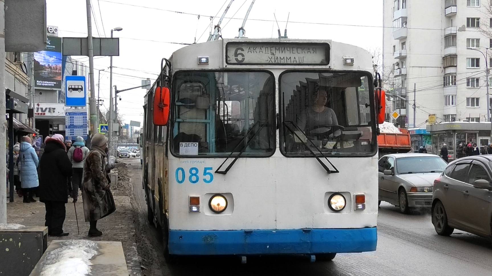 Троллейбус ЗиУ-682Г-012 [Г0А] борт. №085 маршрут №6 "Академическая - Химмаш" следует через остановку "Дом кино". Город Екатеринбург, Россия. Приписка: Октябрьское троллейбусное депо. 01.03.2023