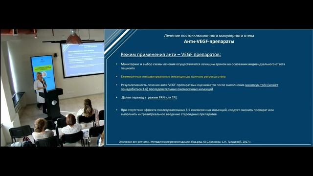 Спикер: Гордеева Марина Владимировна, врач-офтальмолог, ретинолог, кандидат медицинских наук. - Стаж работы более 11 лет. - Специалист в области диагностики и лечения заболеваний сетчатки (возрастная макулярная дегенерация, диабетическая ретинопатия, периферические дистрофии сетчатки, окклюзии вен сетчатки, центральная серозная хориоретинопатия и многие другие). 00:00 Вступление 01:02 Лечение окклюзии ЦВС и ее ветвей 02:48 Постокклюзионная ретинопатия 04:36 Методы обследования 06:08 Постокклюзионная ретинопатия 07:18 Признаки ишемической окклюзии 08:51 Неоваскуляризация сетчатки 09:18 Постокклюзионный макулярный отек - ОКТ признаки 10:43 Неишемическая окклюзия ЦВС + постокклюзионный макулярный отек 10:59 Ишемическая окклюзия верхне-височной ветви ЦВС постокклюзионный макулярный отек 11:39 Лечение окклюзии ЦВС и ее ветвей 15:30 Общие рекомендации 17:00 Лечение постокклюзионного макулярного отека 29:00 Лечение посттромбоиического макулярного отека 31:12 Клинический пример 33:26 Лечение постокклюзионной ретинопатии 42:35 Общая схема лечения и наблюдения постокклюзионной ретинопатии 44:05 Общая схема лечения постокклюзионного макулярного отека На семинаре подробно разбрали тактику ведения пациентов с окклюзиями вен сетчатки: нужно ли таких пациентов срочно госпитализировать в стационар или можно лечить амбулаторно? Куда направлять и какие рекомендации давать в остром периоде заболевания. Отдельно рассмотрели постокклюзионный макулярный отек и все доступные варианты интравитреальных инъекций ингибиторов ангиогенеза и стероидных препаратов для его лечения.