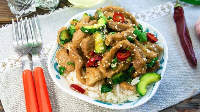 Яркий вкус с пикантной ноткой. ЖАРЕНАЯ СВИНИНА С ОГУРЦАМИ
